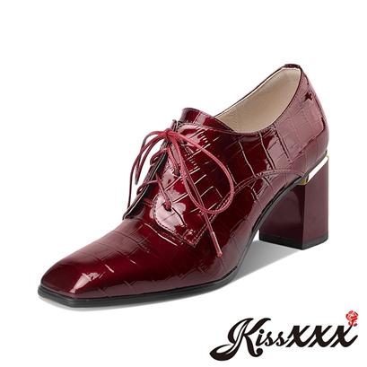 全真皮鱷魚皮紋復古方頭亮漆皮美腿效果高跟踝靴 酒紅 |