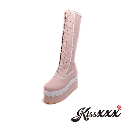 個性撞色蕾絲花邊鬆糕厚底蘿莉塔風格綁帶長靴 粉 |