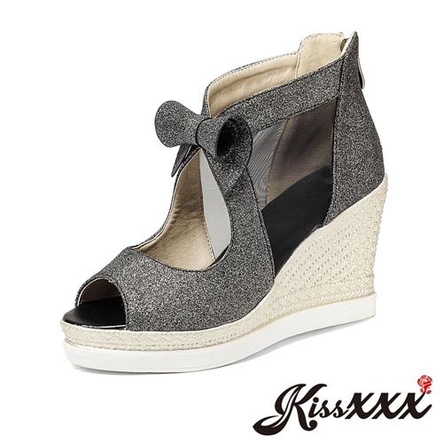 璀璨亮片優雅線條捲筒蝴蝶結網紗拼接坡跟涼鞋 黑 |