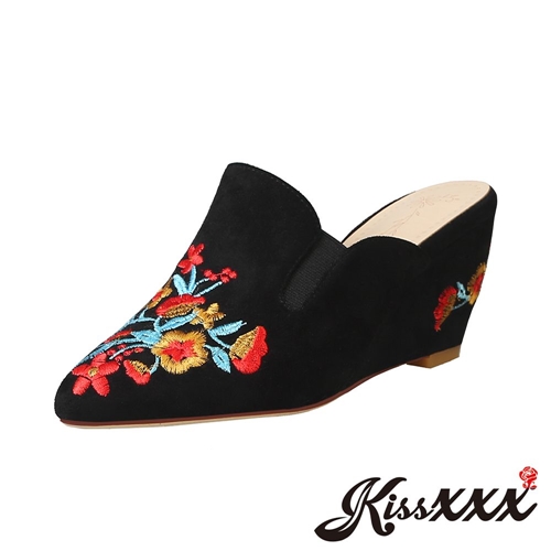 羊猄絨皮中國風花朵刺繡楔形坡跟包頭拖鞋 黑 |