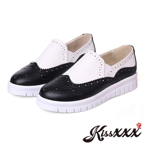 復古布洛克雕花撞色拼接厚底休閒樂福鞋 黑 |