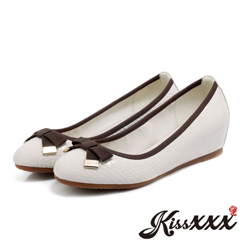 內真皮蛇紋漆皮壓紋小圓頭蝴蝶結造型平底坡跟娃娃鞋 杏 |