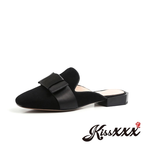 全真皮質感翻絨羊皮一字緞面蝴蝶結飾帶低跟拖鞋 穆勒鞋 黑 |