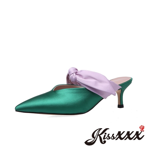 時尚撞色尖頭V口蝴蝶結一字帶高跟拖鞋 綠 |