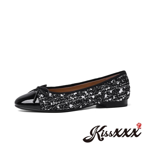 全真皮時尚格紋拼接圓頭撞色蝴蝶結低跟娃娃鞋 黑 |