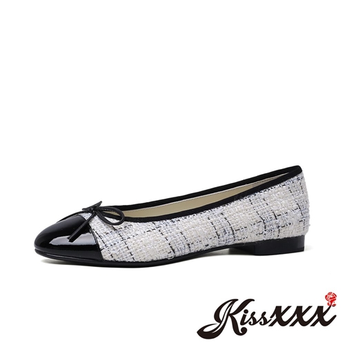 全真皮時尚格紋拼接圓頭撞色蝴蝶結低跟娃娃鞋 白 |
