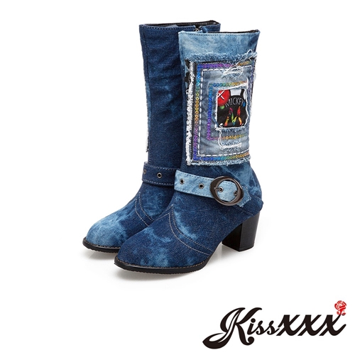 文藝復古風嬉皮拼接皮帶釦飾粗跟牛仔中筒靴 藍 |