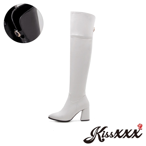 美腿效果帥氣漆皮騎士風尖頭粗跟過膝長靴 白 |