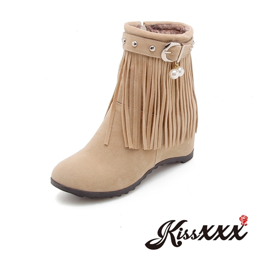珍珠皮帶釦飾流蘇造型內增高短靴 米 |