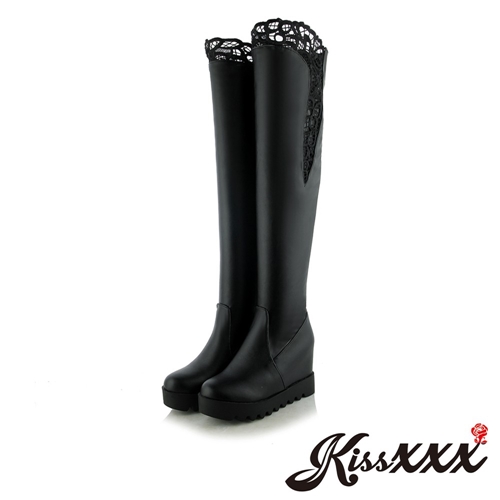 性感蕾絲拼接內增高厚底過膝長靴 黑 |