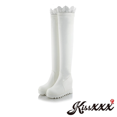立體手工蕾絲花靴口厚底內增高過膝長靴 白 |