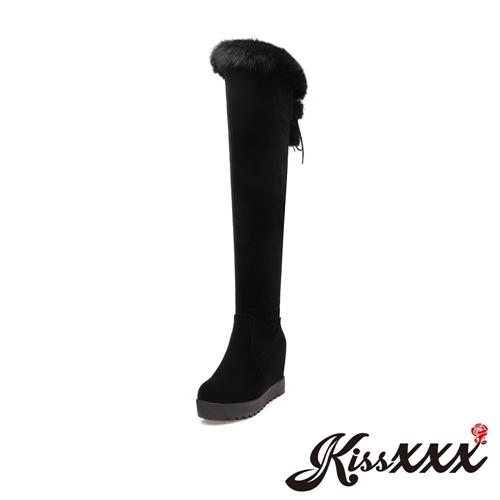 兔毛靴口後綁帶厚底內增高過膝長靴 黑 |