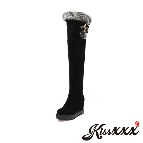 兔毛靴口雙皮帶釦飾厚底內增高過膝長靴 黑 |