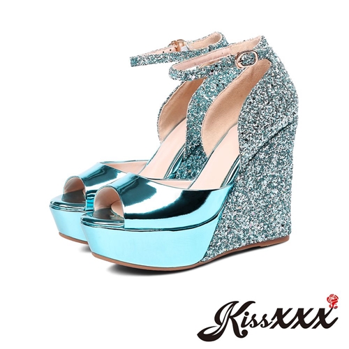 真皮炫彩金蔥拼接魚口防水台厚底坡跟繫帶涼鞋 藍 |