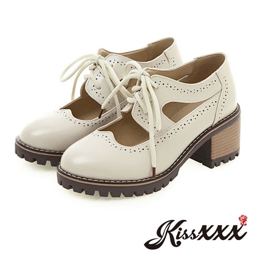 復古布洛克雕花縷空一字綁帶造型粗跟牛津鞋 米 |