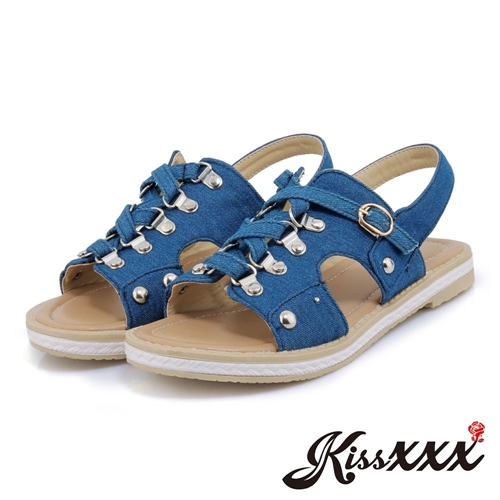 丹寧牛仔復古鉚釘交叉綁帶皮帶釦飾平底涼鞋 藍 |