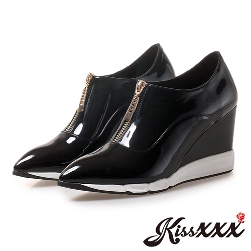 美腳效果尖頭亮漆皮深口坡跟單鞋 黑 |