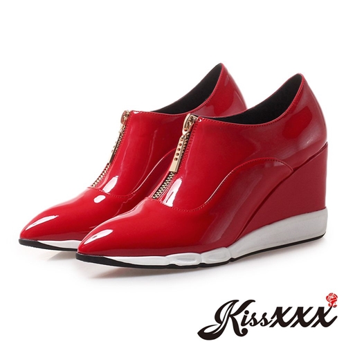 美腳效果尖頭亮漆皮深口坡跟單鞋 紅 |