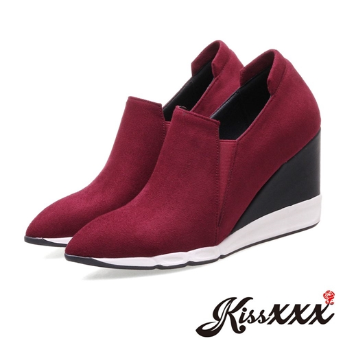 美腳效果尖頭絨皮深口坡跟樂福鞋 酒紅 |