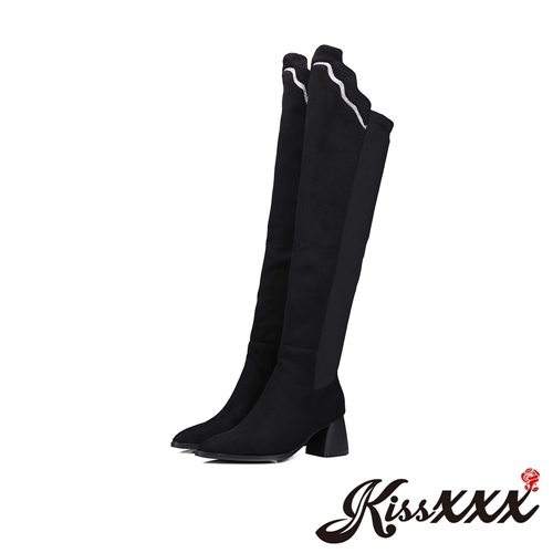 宮廷風金蔥壓線不規則靴口拼接尖頭粗跟過膝長靴 黑 |