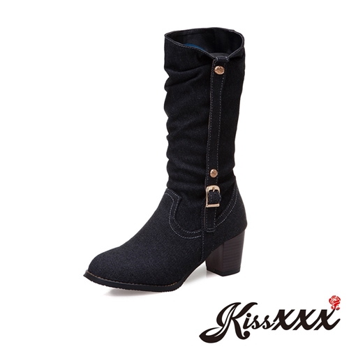 復古皮帶釦飾牛仔布造型百搭粗跟中筒靴 黑 |