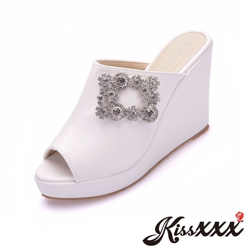 個性百搭歐美復古魚口露趾璀璨方釦防水台楔形拖鞋 白 |