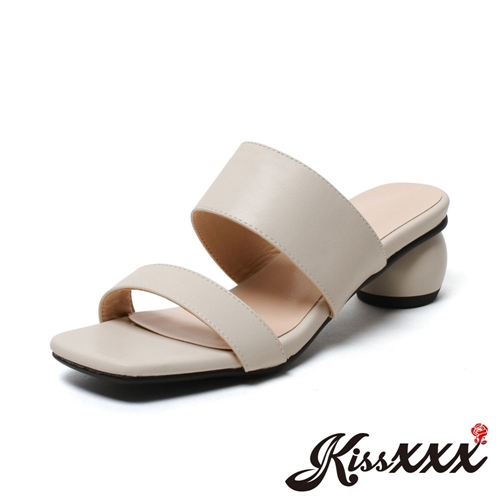 經典方頭復古一字帶異型跟拖鞋 米 |
