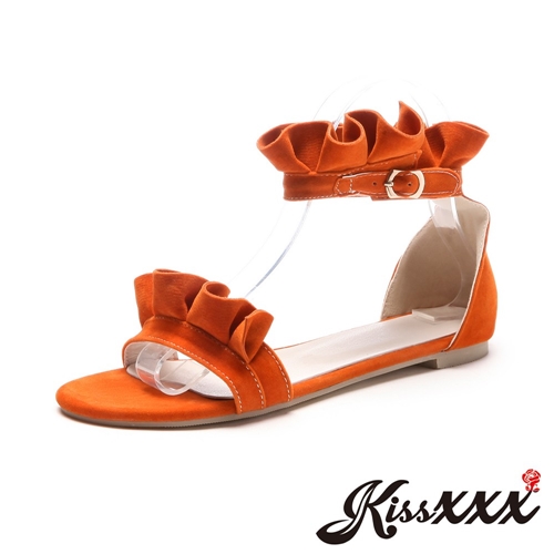 甜美荷葉花邊一字帶繞踝造型平底涼鞋 橘 |