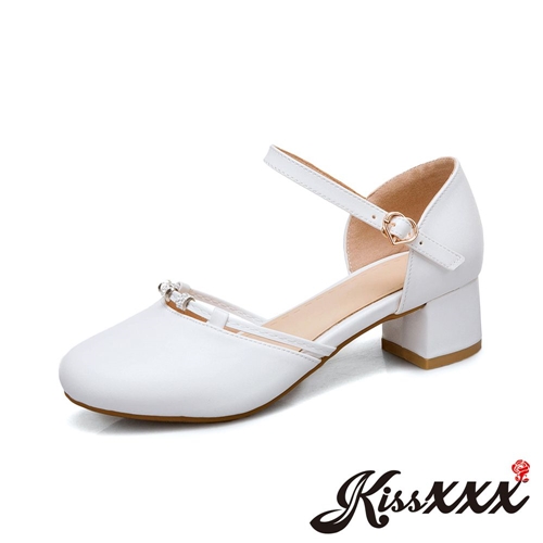小圓頭淺口美鑽串珠造型粗跟涼鞋 白 |