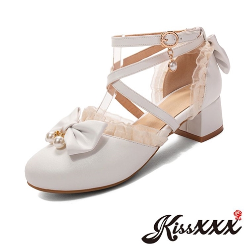 蕾絲花邊甜美蝴蝶結交叉繞帶粗跟涼鞋 白 |