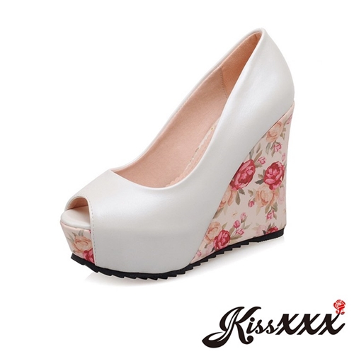 田園玫瑰印花拼接魚口露趾楔形高跟鞋 白 |