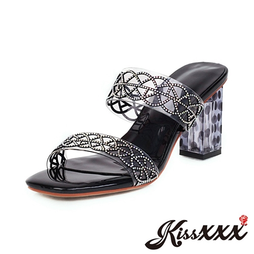 璀璨貼鑽圈圈造型一字透明帶水晶粗跟高跟拖鞋 黑 |