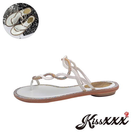 性感美鑽蛇鍊麻花造型平底夾腳拖鞋 白 |