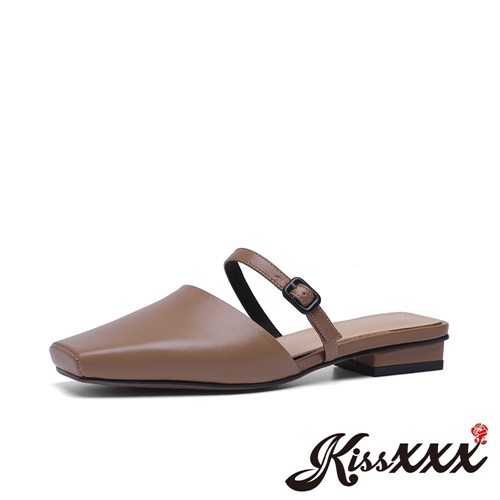 真皮頭層牛皮方頭淺口一字皮帶釦飾個性低跟拖鞋 棕 |