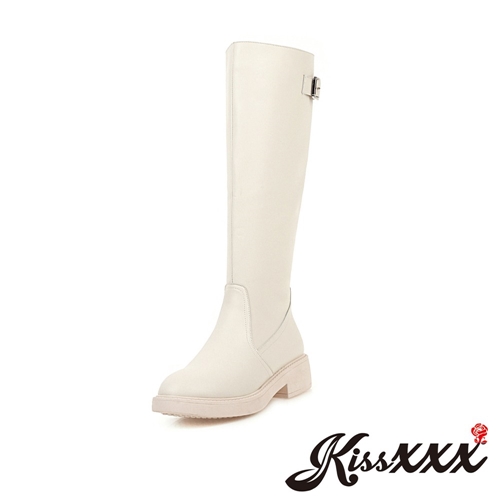 經典復古簡約釦環純色素面造型時尚低跟長靴 米 |