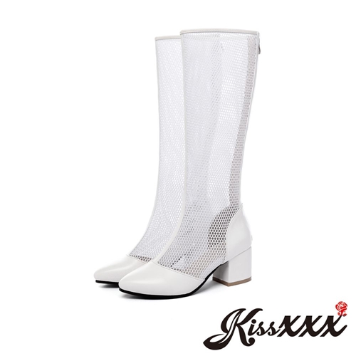 美腿效果魚眼網面拼接性感造型粗跟長靴 白 |
