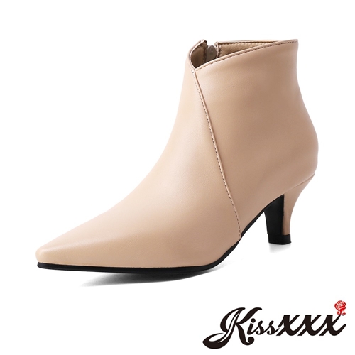 純色交叉尖頭V口百搭低跟踝靴 米 |