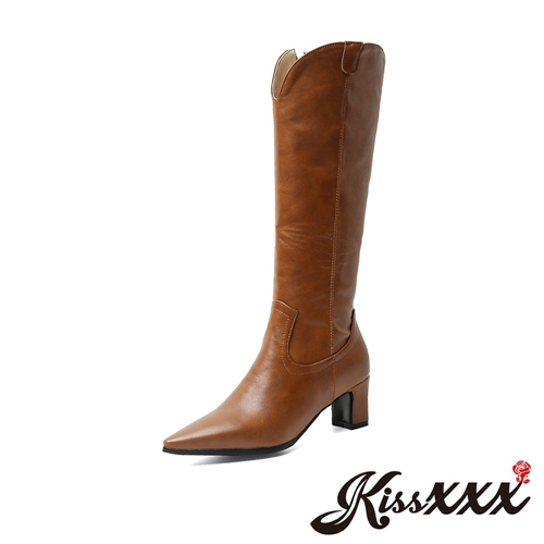 尖頭美腿效果百搭復古剪裁粗跟長靴 棕 |