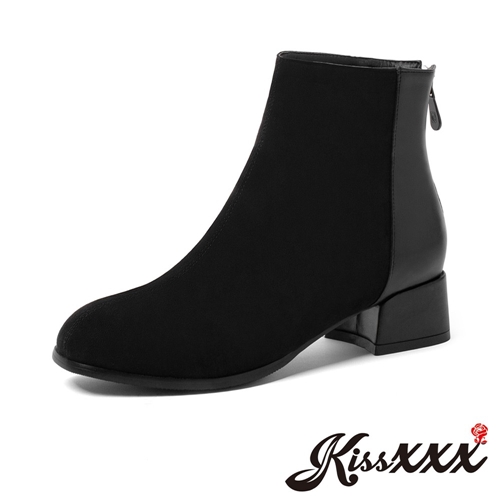 經典小方頭異材質拼接素面百搭粗跟短靴 黑 |