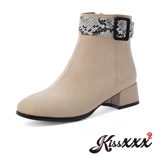 時尚蛇紋皮帶釦飾復古造型粗跟短靴 米 |