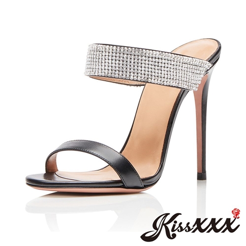 [訂製]唯美一字透明帶拼接華麗水鑽飾帶高跟拖鞋 黑 |