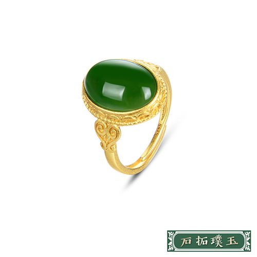 純銀925古法金典雅碧玉鑲嵌造型開口戒 *石拓璞玉* |