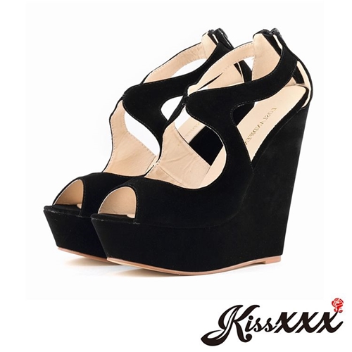質感磨砂絨面魚口露趾設計款曲線鏤空造型楔形坡跟涼鞋 多色任選 |