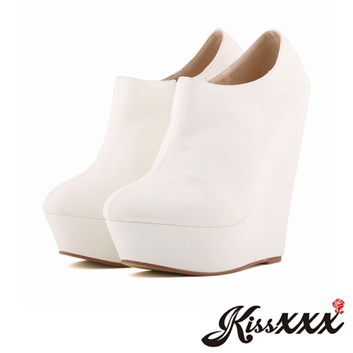 質感磨砂絨面經典圓頭美腿效果楔形坡跟踝靴 白 |