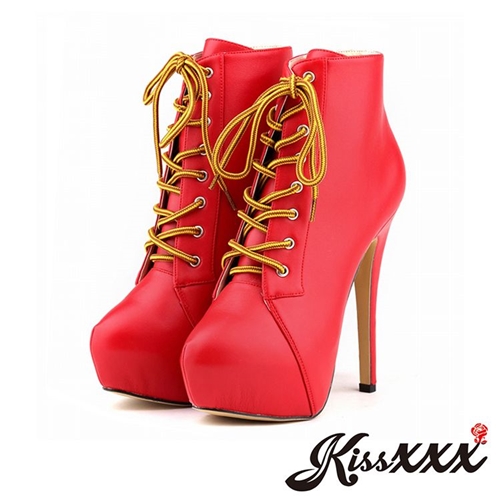 復古小圓頭質感皮面防水台高跟綁帶踝靴 紅 |