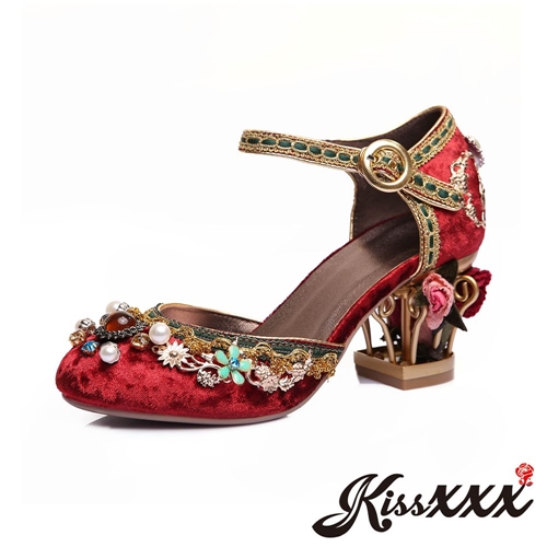 內真皮質感金絲絨異國風華麗寶石串珠造型異形花籃跟高跟涼鞋 酒紅 |