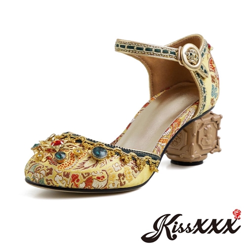 藝術方跟刺繡美鑽異國民族風時尚高跟涼鞋 黃 |