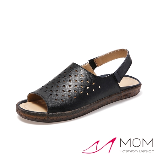真皮復古菱格刻花縷空舒適平底涼鞋 黑 |