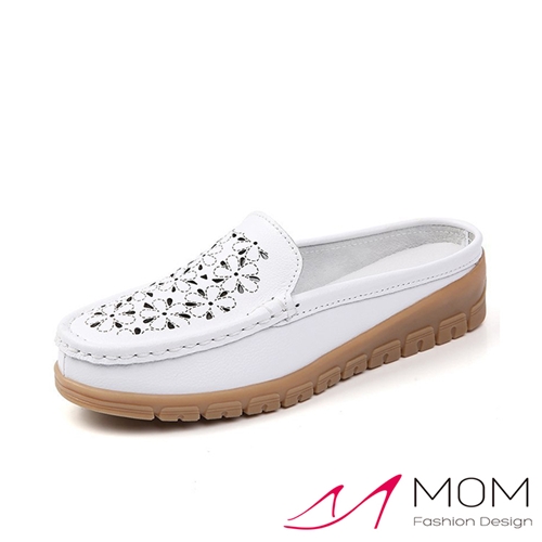 真皮典雅花朵印花縷空包頭坡跟拖鞋 白 |