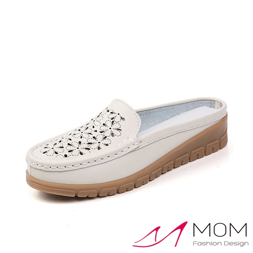 真皮典雅花朵印花縷空包頭坡跟拖鞋 米 |